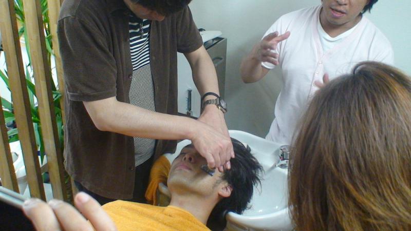 吉田さんが試し剃りをしています。
